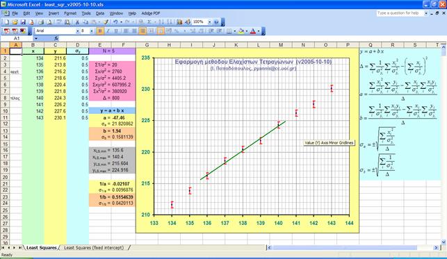 Στη γενική περίπτωση (φύλλο εργασίας «Least Squares»), μετά τη εισαγωγή των παραπάνω, γίνονται αυτόματα οι υπολογισμοί και εμφανίζονται τα αποτελέσματα όπως στο παράδειγμα του σχήματος 1.