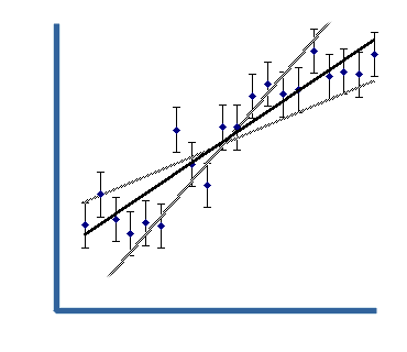 Το σφάλμα στην κλίση εκτιμάται αν θεωρήσουμε ευθείες με τη μέγιστη και ελάχιστη κλίση, για τις οποίες δεχόμαστε ότι οριακά προσαρμόζονται στα δεδομένα. Αν συμβολίσουμε τις κλίσεις των ευθειών αυτών με λmax και λmin, το σφάλμα στην κλίση δλ υπολογίζεται από την σχέση: